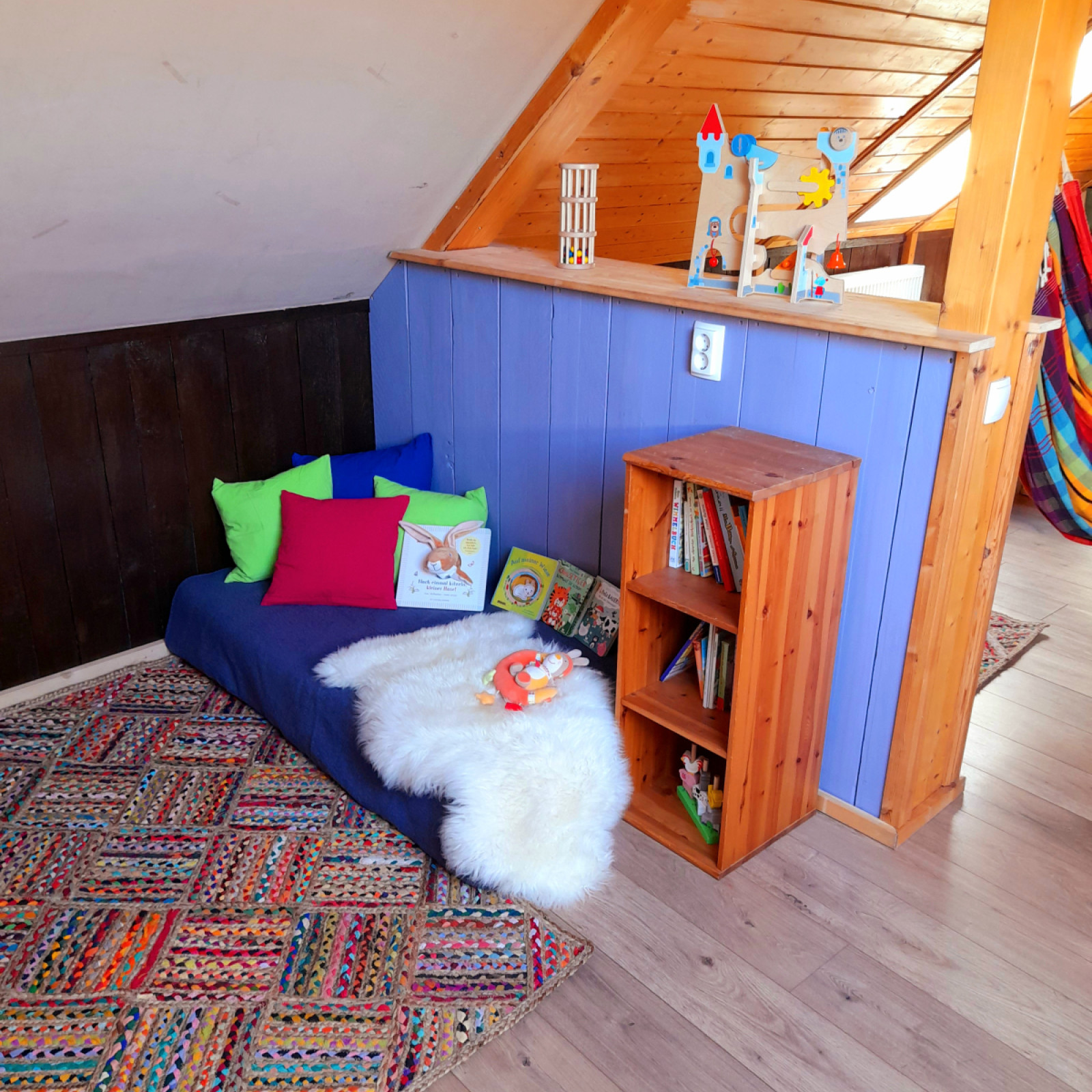 Das Dachgeschoss ist ca. 35 qm groß und kleinkindgerecht eingerichtet. Es verfügt über einen großen Gruppenraum und einen angrenzenden Raum zum Schlafen. Jedes Kind hat dort seinen eigenen, festen Schlafplatz.
