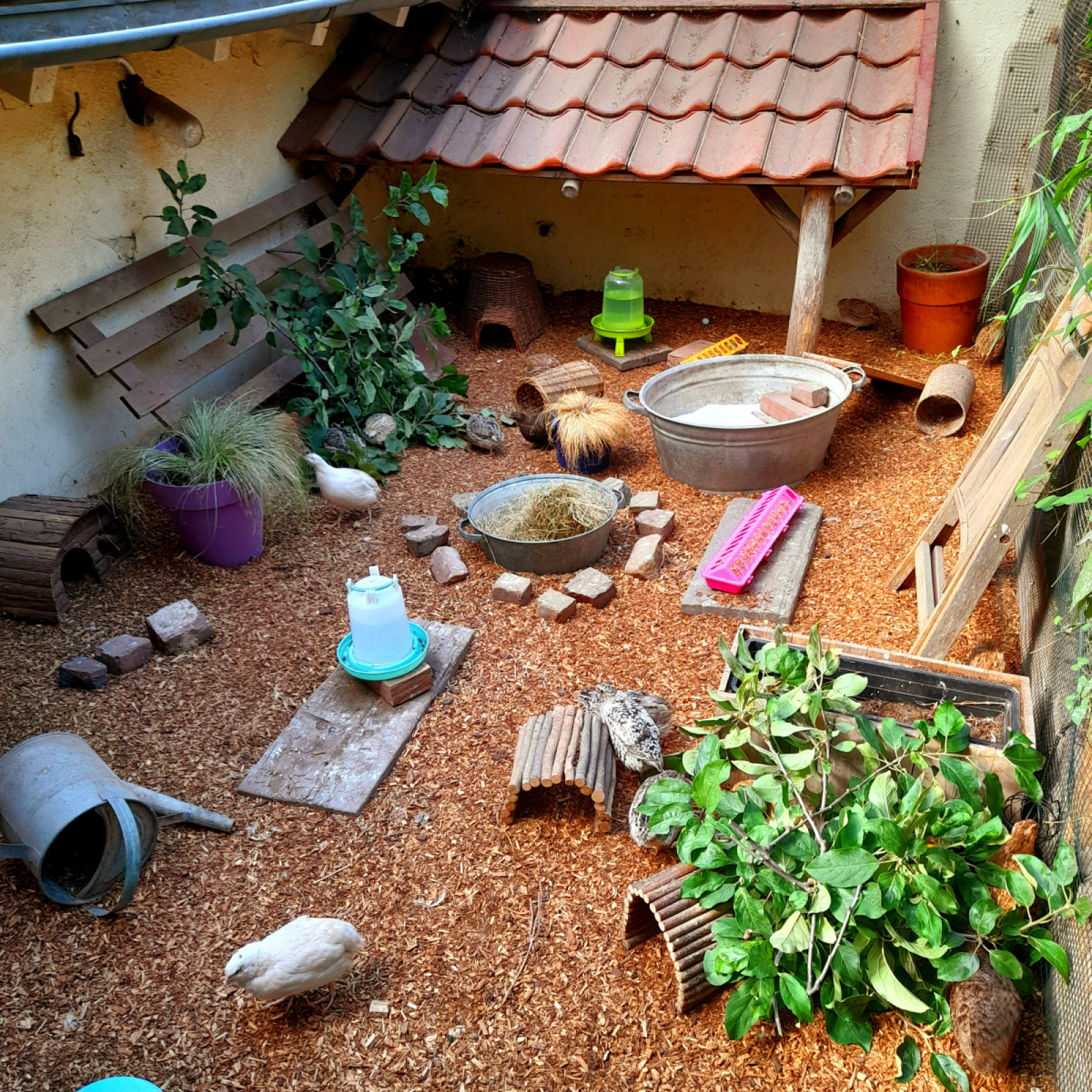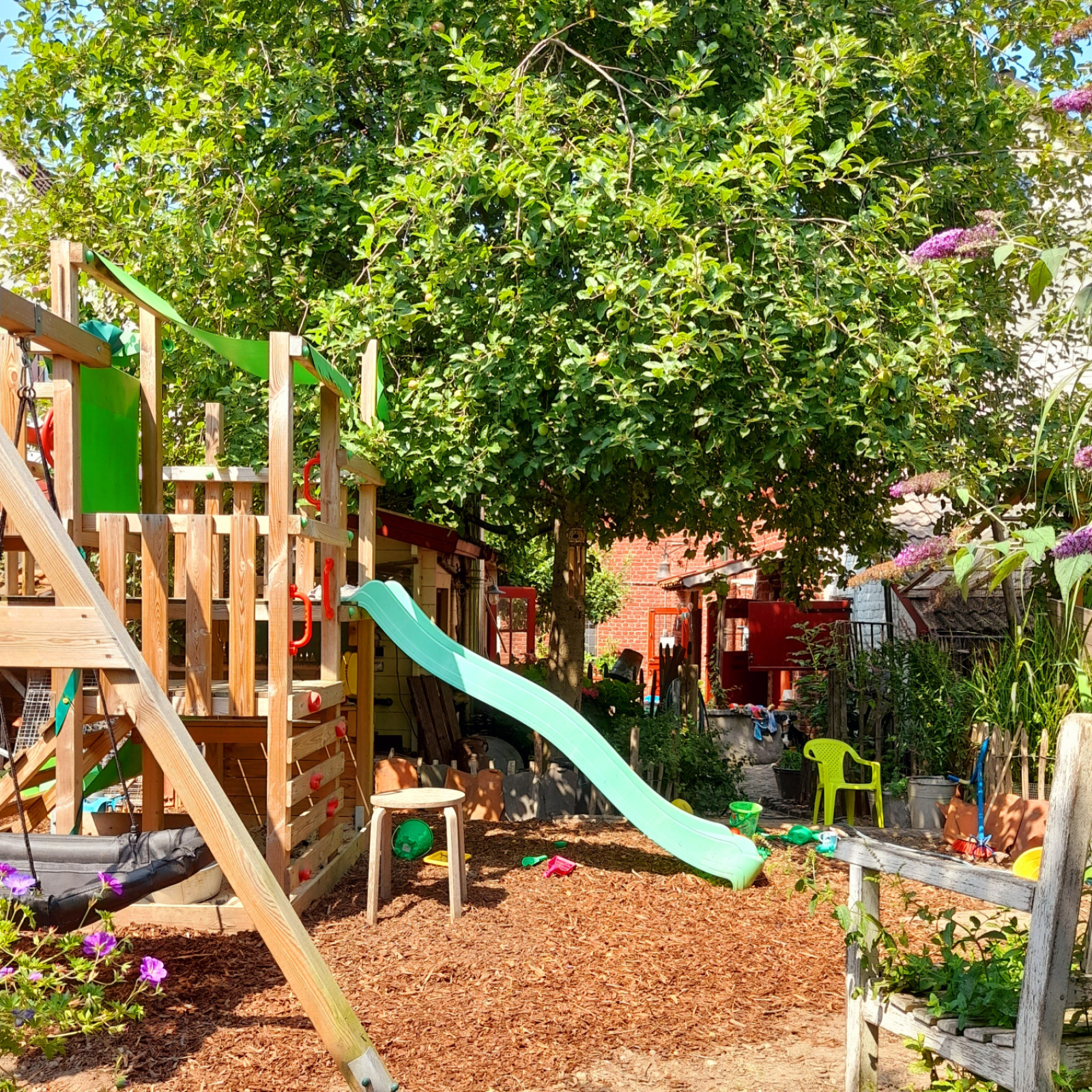 Im Außenbereich erwartet die Kinder ein geräumiger Innenhof, unser urig angelegter Garten mit vielen Sträuchern und Beeten, die gepflegt und geerntet werden wollen, sowie unser liebevoll gestaltetes Wachtelgehege. Es gibt reichlich Möglichkeiten zum Spielen, Toben, Erforschen und Entdecken. Gutes Wetter lädt hier zum Rutschauto fahren, mit Kreide malen, Sandburgen bauen und mit Wasser spielen ein. Durch unsere Obstbäume sind die Kinder vor starker Hitze und zu viel Sonne geschützt.